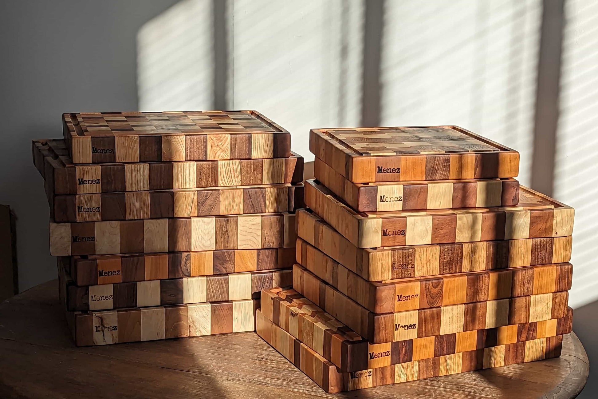 Chaque billot Menez est fabriqué à la main à Saint-Briac à partir d’un assemblage de chêne, châtaignier, noyer, poirier, érable ou merisier. Ce mélange d’essences offre un rendu vivant, chaleureux et unique à chaque pièce.